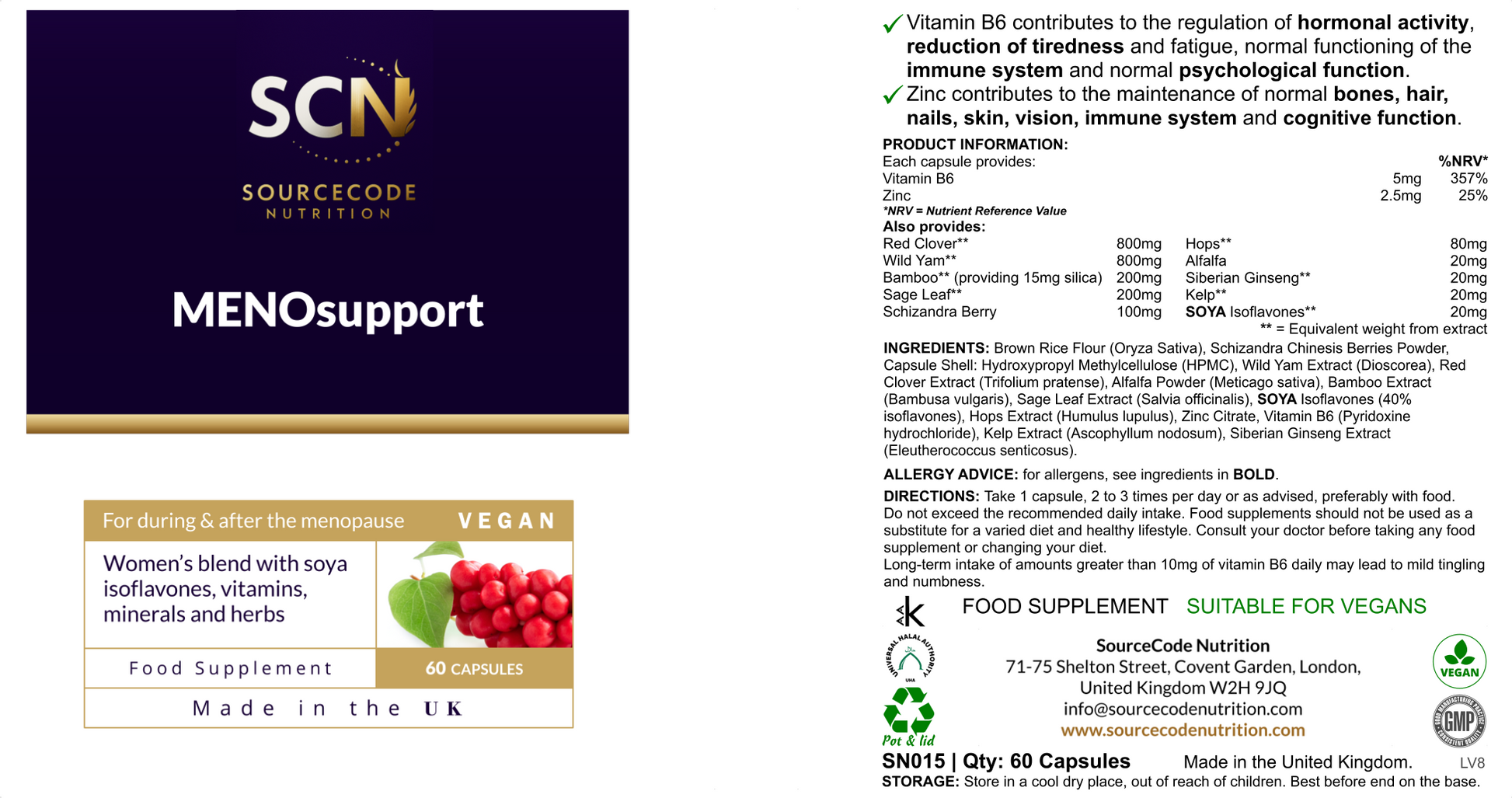 Soy Isoflavone Extract, Vitamin B6 (as Pyridoxine HCl), Zinc (as Zinc Citrate), Vegetable Cellulose Capsule, Rice Flour, Magnesium Stearate.